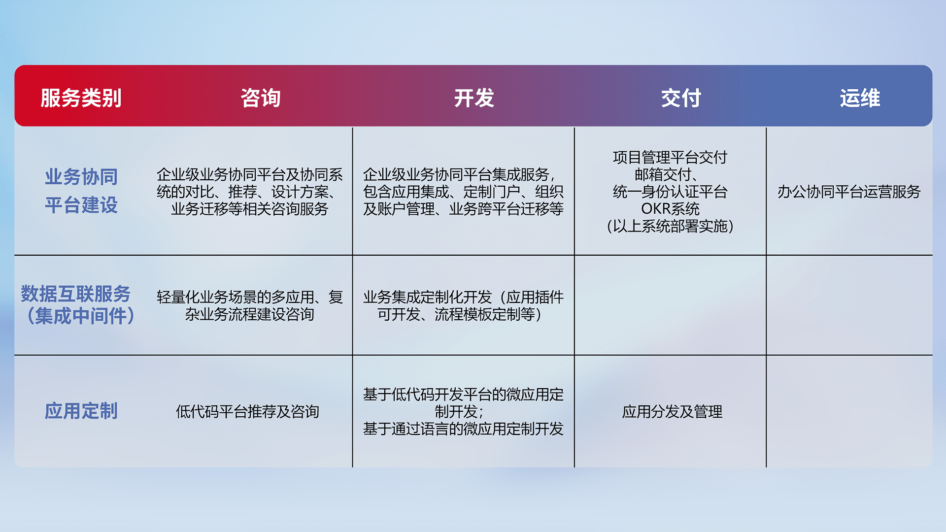 针对钉钉、、企微、、IDaas等平台级产品提供产品的规划、、方案、、、、交付、、、定制化开发等服务,,,,实现如统一协同办公、、智能客户服务、、、、混合会议管理、、、、智能数据查询、、、、等业务场景,,,,实现数字化转型。。。