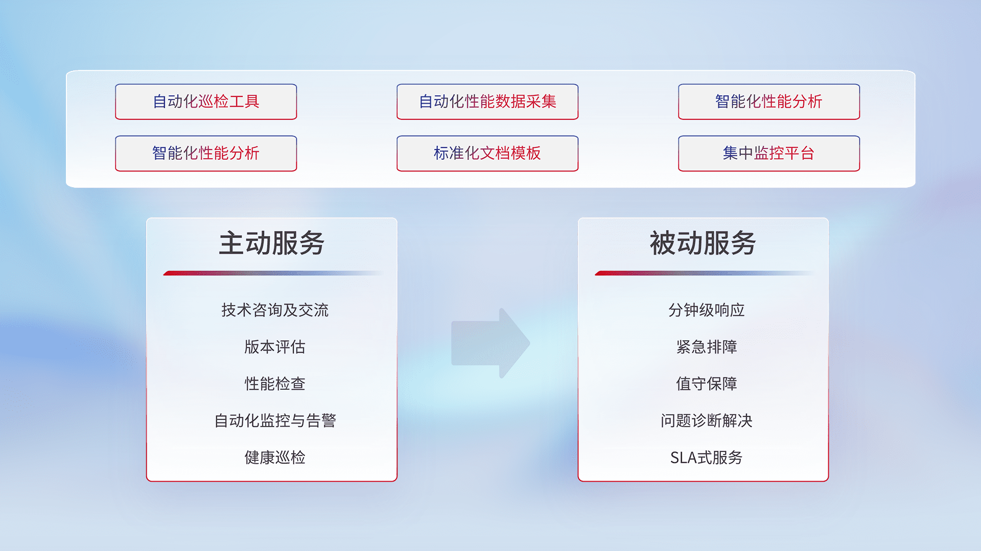 智能化工具和标准化文档,,保障服务质量,,,,提供主动服务(包含技术咨询、、、、版本评估、、、、性能检查、、、、自动化监控与告警、、健康巡检)和被动服务包含(分钟级响应、、、紧急排障、、值守保障、、、问题诊断解决、、、、SLA服务)。。